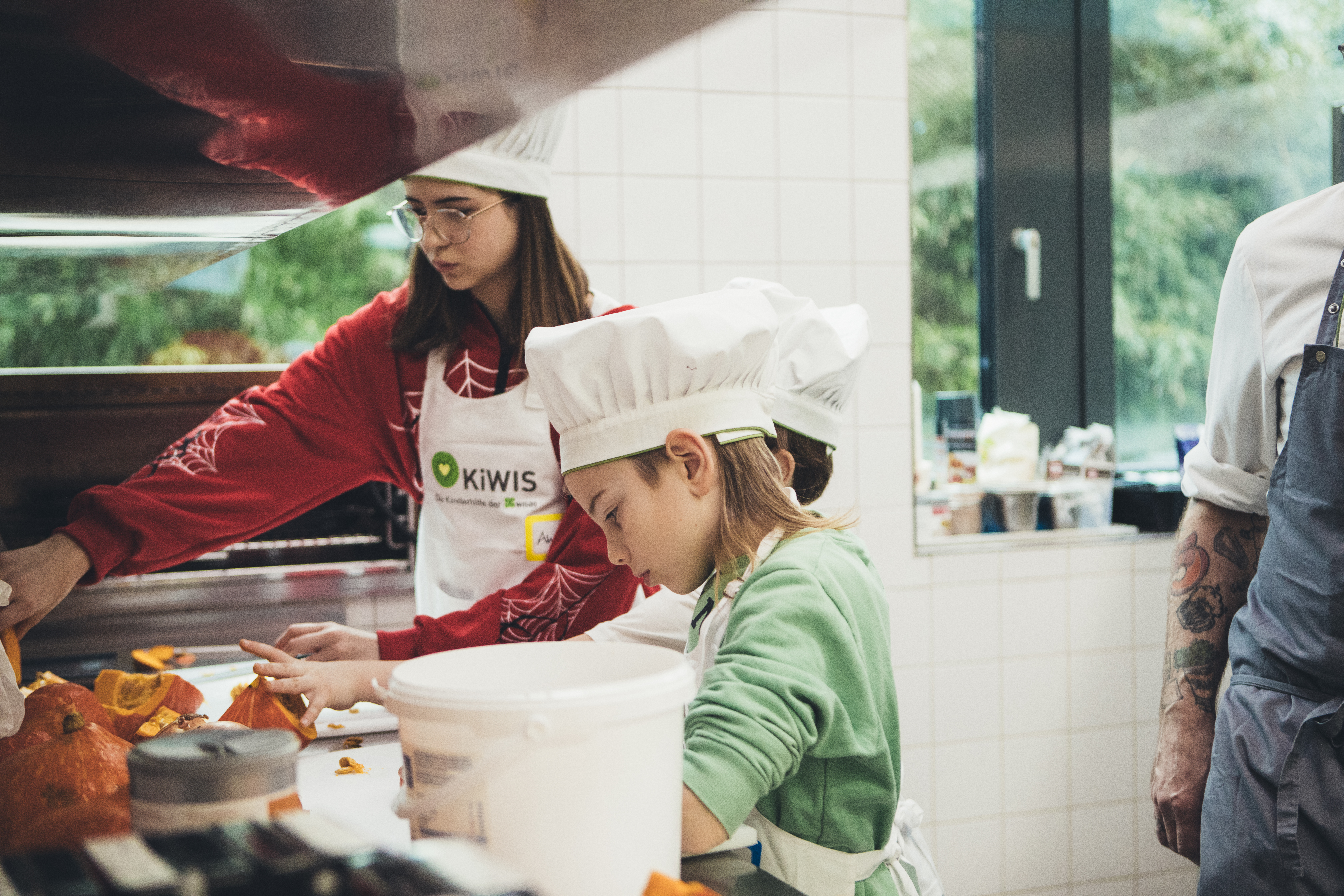 Es wurden Kürbisse für eine cremige Kürbissuppe geschält, Hähnchen filetiert, um knusprige Chicken Nuggets herzustellen und frisches Gemüse für eine leckere Pasta vorbereitet. Dabei lernten unsere KiWis viele Tipps & Tricks für eine gesunde Zubereitung.