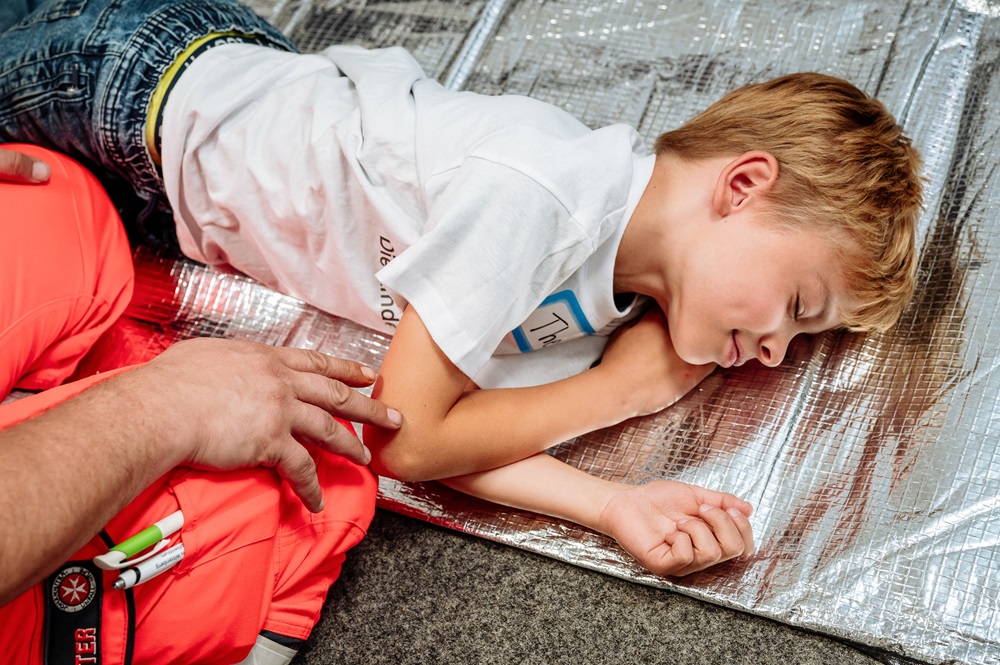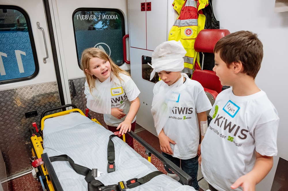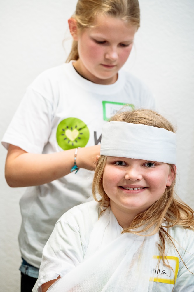 Was ist die stabile Seitenlage? Wie setzt man den Notruf ab? Wie wird ein Verband richtig angelegt? Diesen wichtigen Fragen gingen die Kinder mit Klaus und Ronny von den Johannitern auf den Grund.