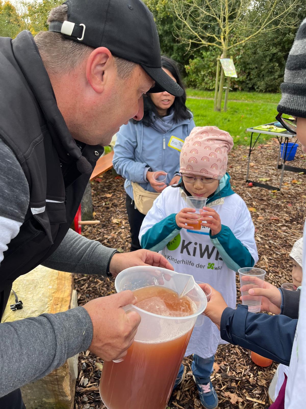 Gemeinsam mit Wisag Koch Daniel Heidemann haben wir Äpfel geerntet, geschnitten und gepresst. Das war ganz schön viel Arbeit, die sich gelohnt hat.