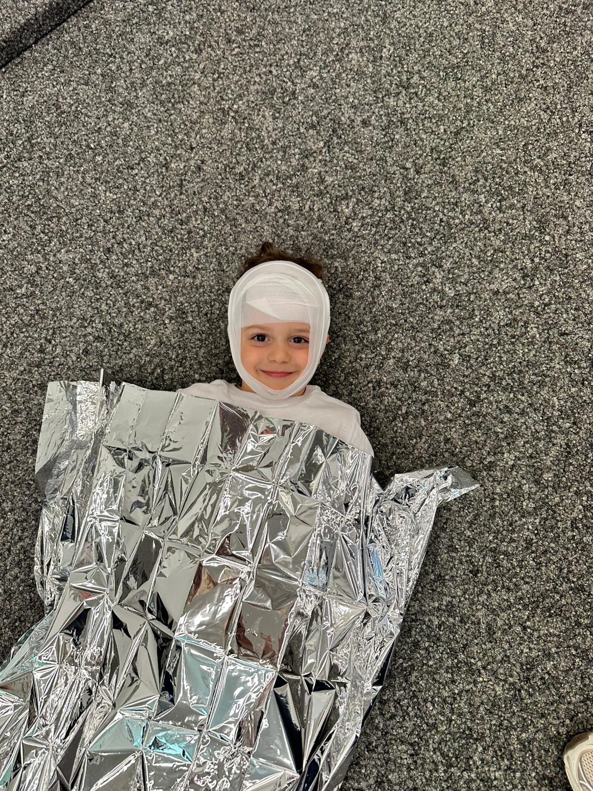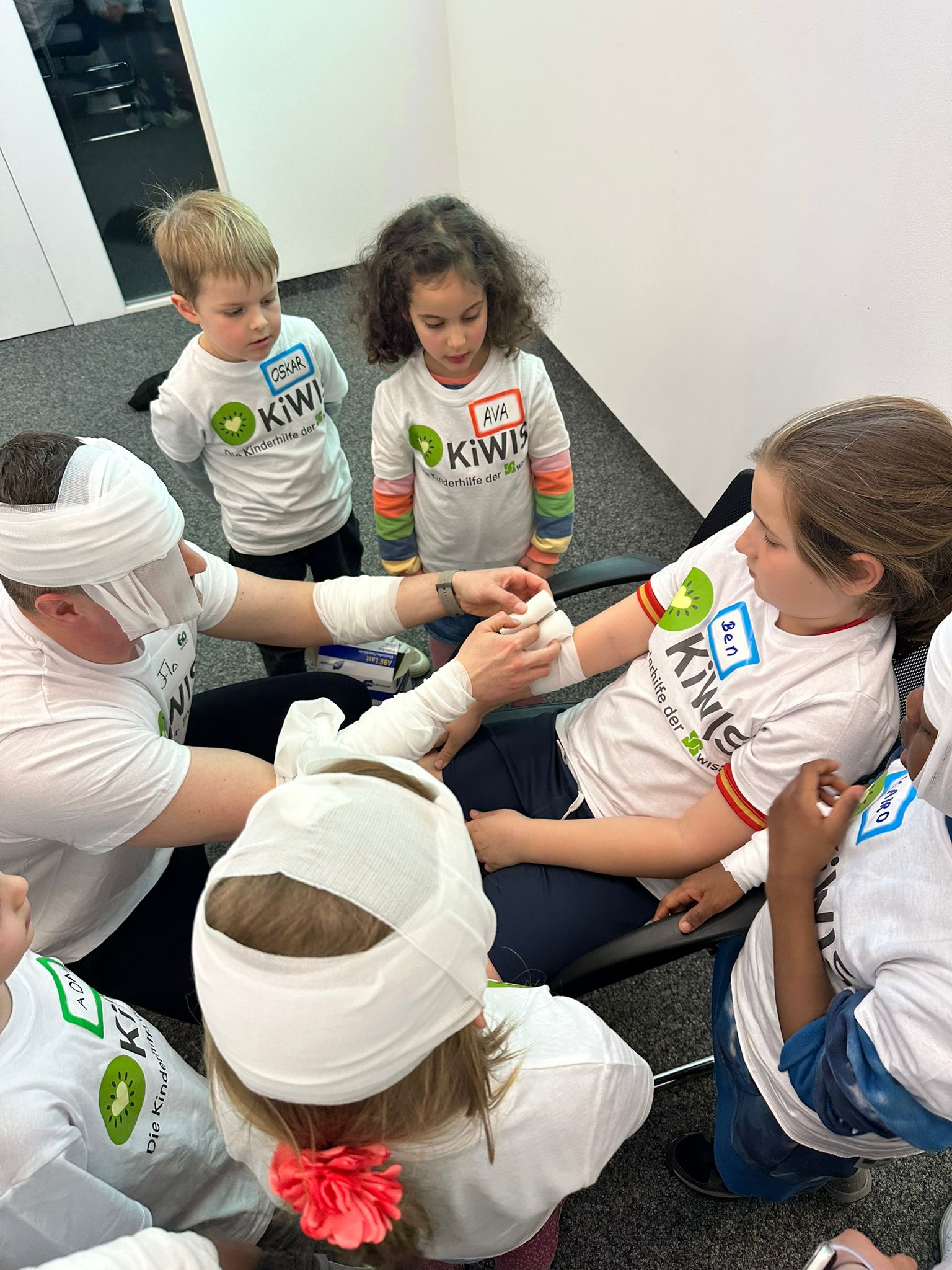 Unsere KiWIS lernten wie man den Notruf richtig durchführt und Verbände anlegt. Auch wichtige Alltagssituationen wie der Umgang mit Wunden, Verbrennungen, Nasenbluten oder Verschlucken wurden besprochen. Besonders spannend war das Üben der Reanimation an Puppen, bei dem die Kinder selbst aktiv werden konnten.