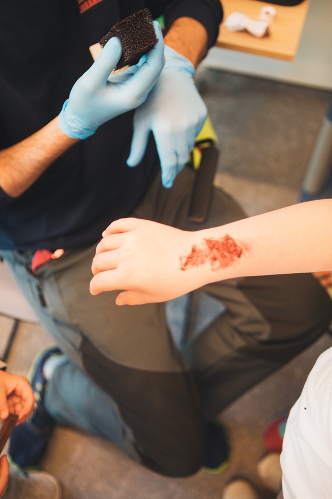 Die Kinder übten mit großer Begeisterung den Notruf abzusetzen, lernten Verbände anzulegen und trainierten die stabile Seitenlage. Ein besonderes Highlight des Tages war das Schminken realistischer Wunden.