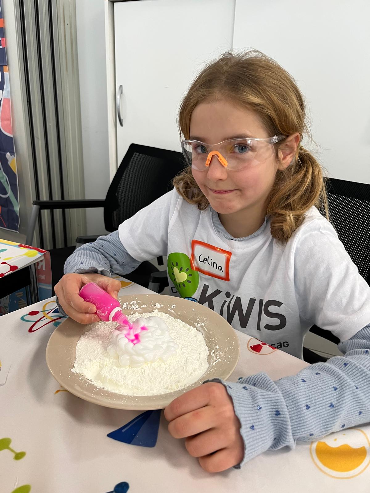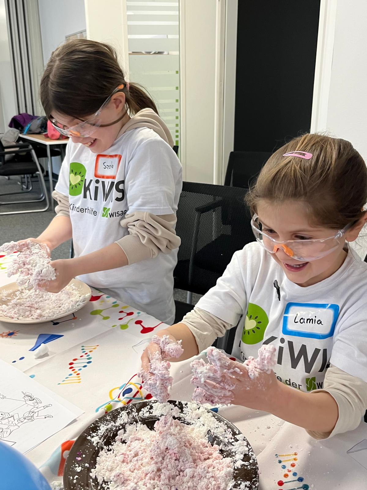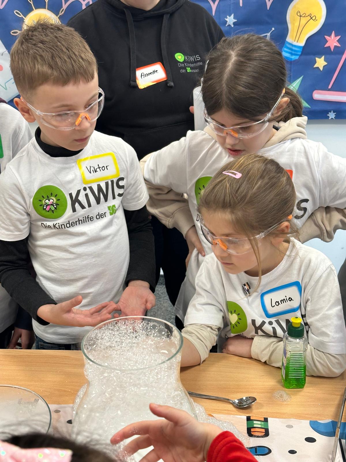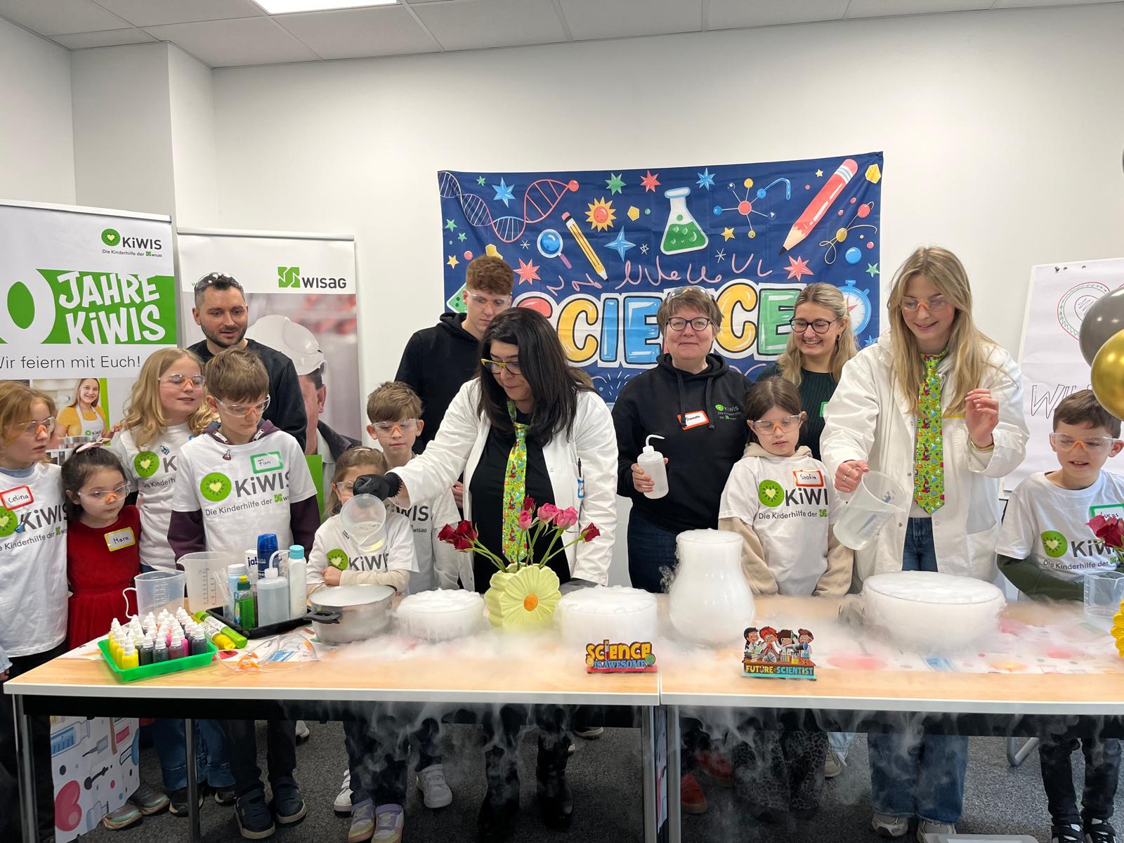Zu den Highlights gehörte das „KiWIS-Wunder“, bei dem ein Schriftzug aus Teelichtern scheinbar wie von Geisterhand erlosch – ein Experiment, das für echte Gänsehaut sorgte. Große Faszination lösten auch die tanzenden Nebelwasserfälle und Seifenblasen aus, die die Kinder selbst erforschen und berühren konnten. Beim Experiment „Wölkchenknete“ stellten die Nachwuchsforscher schließlich aus einfachen Zutaten ihren eigenen „Cloud Dough“ her und nahmen ihre Kreationen stolz mit nach Hause.