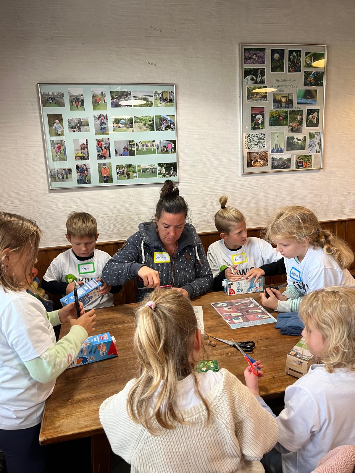 Im Anschluss ging es in den Innenbereich, wo unsere KiWIS im Sinne der Wiederverarbeitung aus alten T-Shirts kreative Taschen und aus leeren Tetra Paks originelle Geldbeutel bastelten.